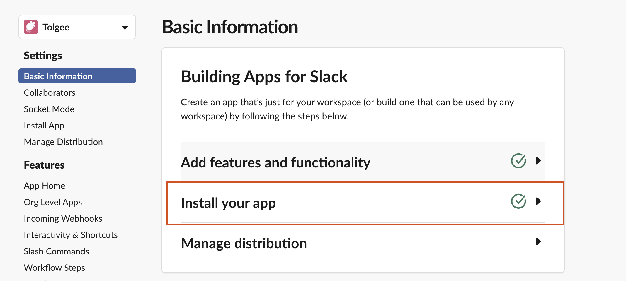 First of all you need to create a new app in your Slack workspace. You can do that by navigating to Slack Apps page and clicking on Create New App. To know more about creating an app in Slack, you can refer to the official documentation. After creation, you need to install the app in your workspace: